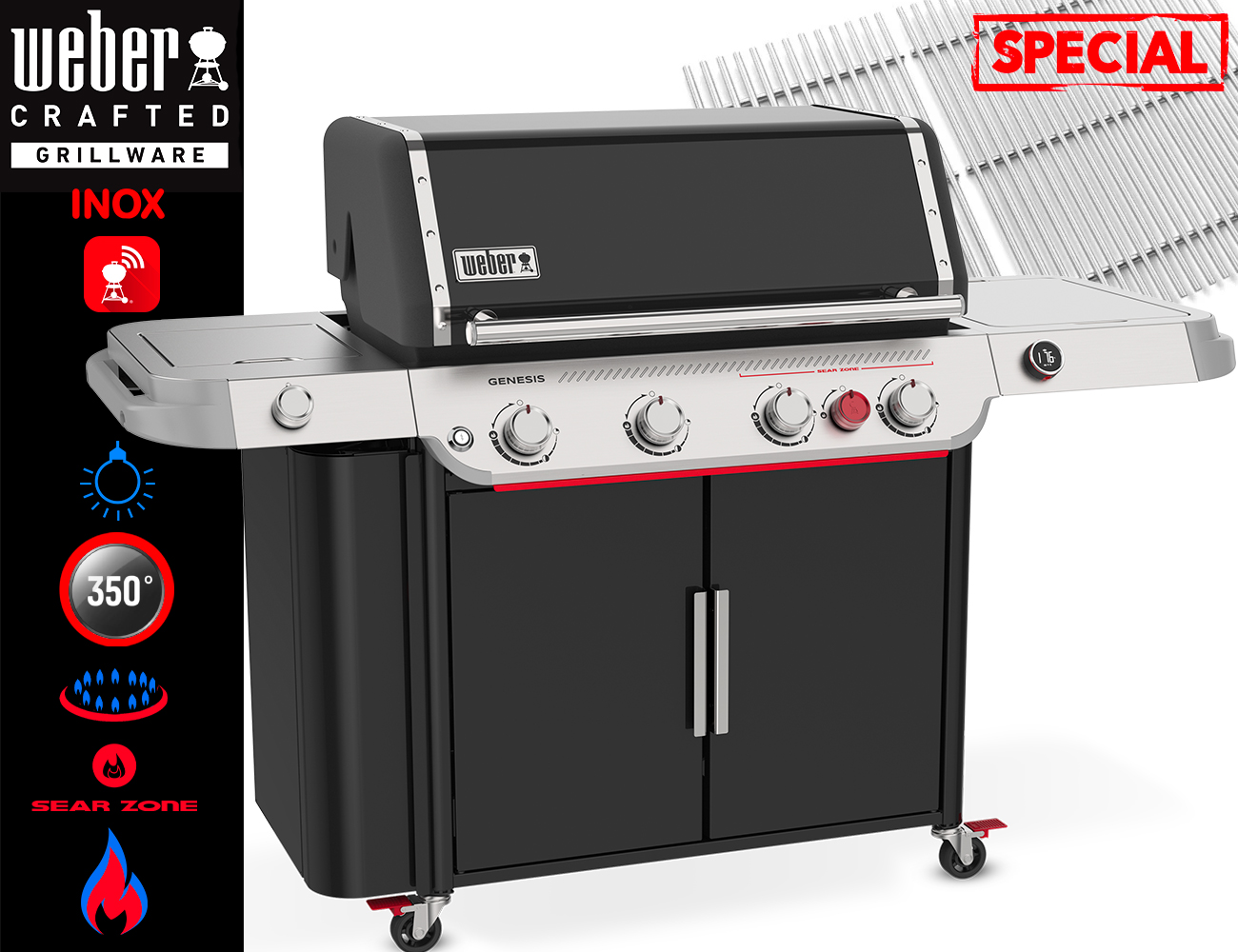 Un barbecue dalle prestazioni superiori con 4 bruciatori, area di rosolatura per un calore extra e fornello laterale. Design accattivante e finiture premium.