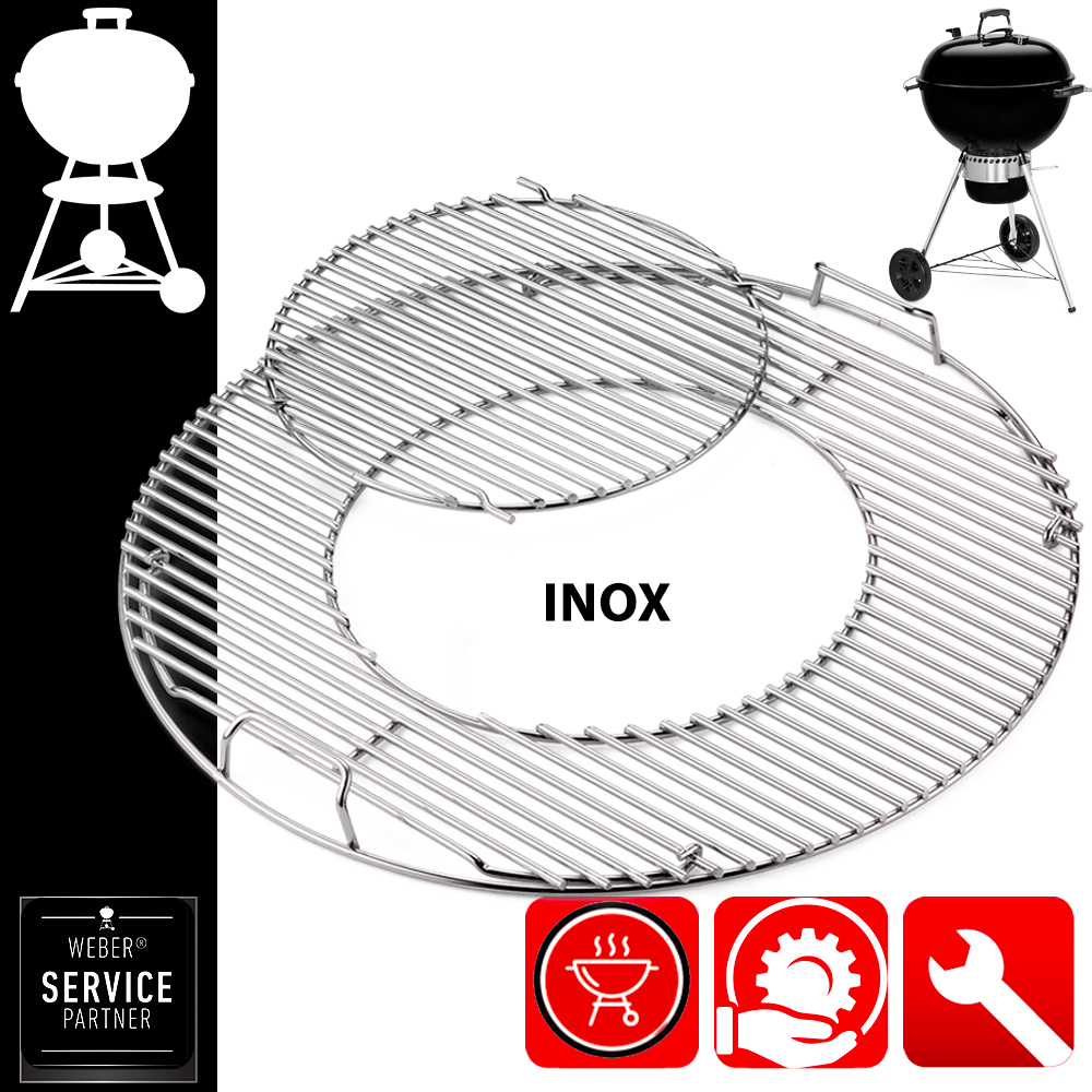 Griglia in filo d’acciaio inox, con centro staccato e asportabile, in modo da permettere l’utilizzazione di tutti gli accessori gourmet, e di continuare il grill lungo il bordo. Adatto a tutti i modelli a carbone con ø 57 cm.