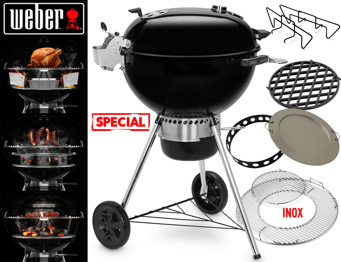 Il Master Touch ha in dotazione il supporto di serie per il coperchio che lo rende un comodo paravento, inoltre possiede 2 ganci porta utensili integrati nella maniglia del braciere, fondamentali per avere sempre gli accessori a portata di mano.