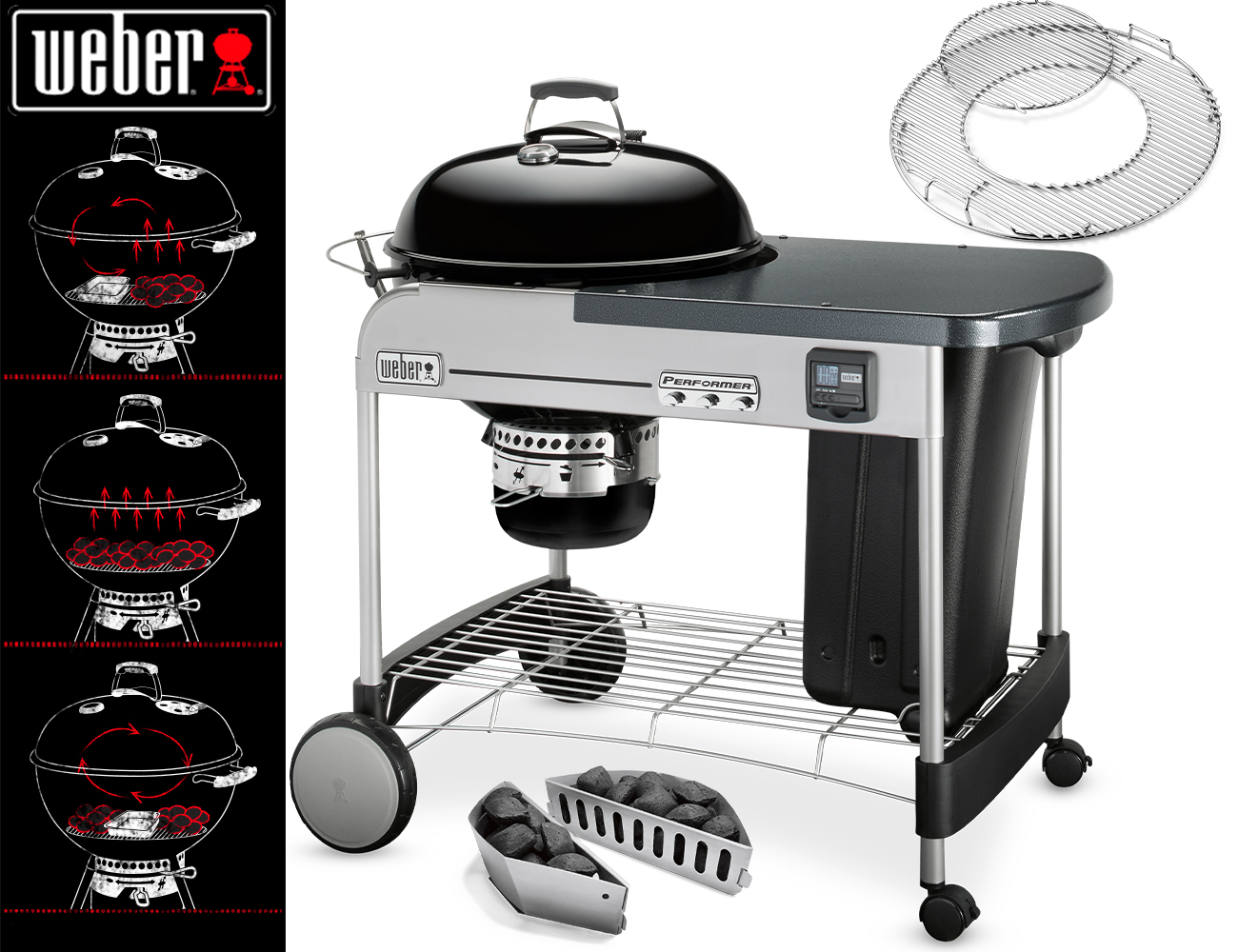 Il barbecue a carbone Weber Performer Premum GBS è noto per i suoi numerosi comfort: primo fra tutti lo spazioso piano di lavoro, che permette di cucinare in maniera semplice e rapida. Inoltre possiede un comodo timer per tenere sempre sotto controllo la cottura. La griglia dispone di un pezzo centrale asportabile per poter utilizzare gli accessori Weber Gourmet. I 3 ganci porta-attrezzi completano la dotazione di questo barbecue, oltre al secchio in plastica integrato nel carrello, il quale permette di stoccare il carbone in protezione da agenti atmosferici e umido.
