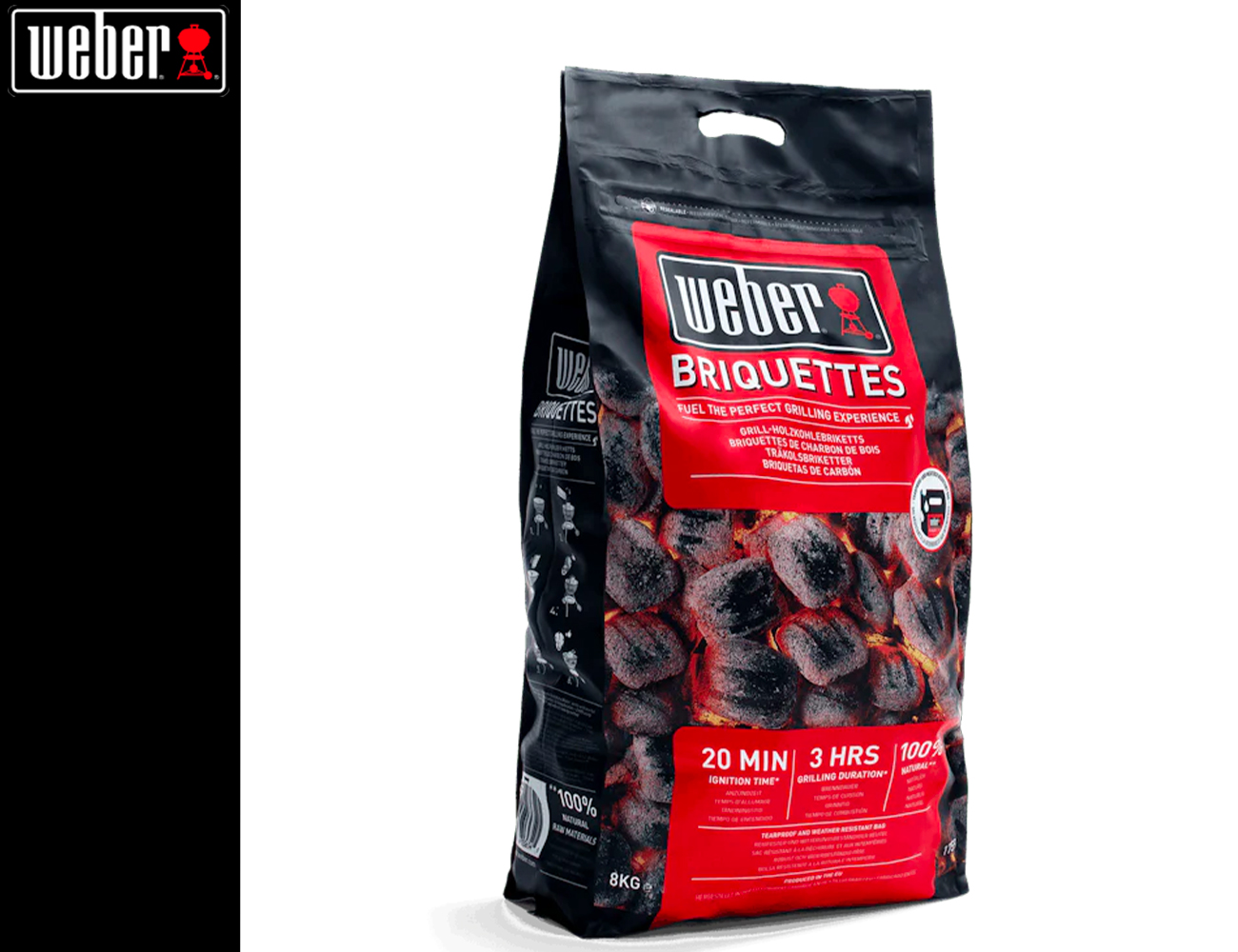 Sacco da 8 kg di bricchetti di carbone Weber. Prodotti con scarti di legno e dalla forma a “grande cuscino”, oltre alle caratteristiche di ecologia e sicurezza, la sua principale è la durata della combustione lunga (mediamente) 3 ore, ideale sia per la cottura indiretta che diretta, in quanto evita il formarsi delle fiammate. Grazie alla ciminiera di accensione anche accenderlo diventa facile come bere un bicchier d’acqua. Questa lunga durata garantirà che se per qualunque motivo l’inizio della grigliata dovesse allungarsi più del previsto, la brace sarà sempre pronta senza doverla riaccendere. Inoltre per quanto riguarda la cottura diretta, una volta finita, chiudendo le valvole di aereazione del barbecue e il coperchio, il carbone si spegnerà cosicchè potrà essere riutilizzato ancora una volta. Ciò rappresenta un risparmio di tempo, fatica e soldi degno di nota rispetto alla tradizionale carbonella, molto spesso fatta di legno di qualità non eccellente.