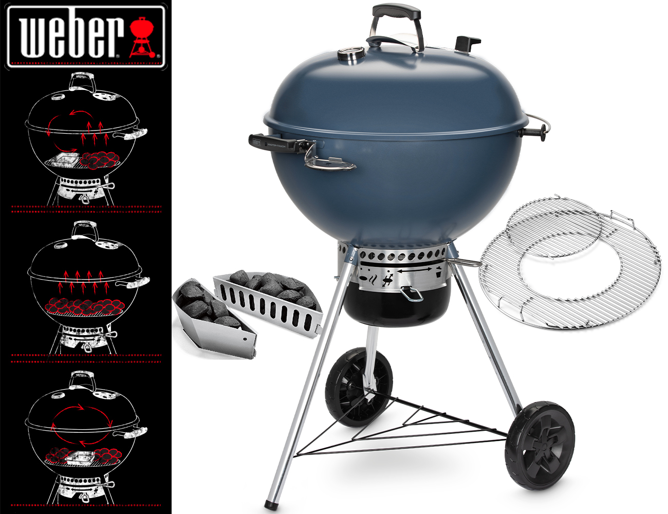 Barbecue in acciaio porcellanato, estremamente resistente alle intemperie e agli agenti atmosferici, ma attenzione a non colpirlo troppo forte. Il Master Touch ha in dotazione il supporto di serie per il coperchio, che permette di renderlo un comodo paravento e quindi di cuocere anche con il vento. Inoltre possiede 2 ganci porta utensili integrati nella maniglia del braciere, fondamentali per avere sempre gli accessori a portata di mano e nel contempo non distrarsi dalla cottura. Altra novità della serie è la griglia gourmet di cottura, che permette di ampliare la gamma di accessori utilizzabili sul barbecue con tutti quanti gli accessori Weber Gourmet. Sul coperchio è presente un utile termometro per la gestione delle temperature, in ogni fase della cottura: sia diretta (grigliata classica con cibo sulla brace), che indiretta (similmente a quella in forno ventilato, con carbone ai lati e cibo al centro della grglia di cottura, lontana dai carboni ardenti), oltre alle cotture cosiddette “low and slow” (bassa temperatura tra 100°C e 110°C). La ventola di areazione sul coperchio dispone di un pratico gommino anti-scottatura che ne permette la movimentazione anche a coperchio caldo, e aprendo o chiudendo la ventola si gestisce comodamente la temperature interna al barbecue. La griglia focolare dispone di 2 cesti separa-carbone utilizzabili in fase di cottura indiretta, per tenere separato il carbone ai lati del braciere. Il Master Touch dispone anche di sistema di raccolta delle ceneri, che faciliterà notevolmente la pulizia del barbecue, raccogliendo tutti i residui della combustione in un pratico pentolino facile da separare dal barbecue e da rimettere al suo posto.