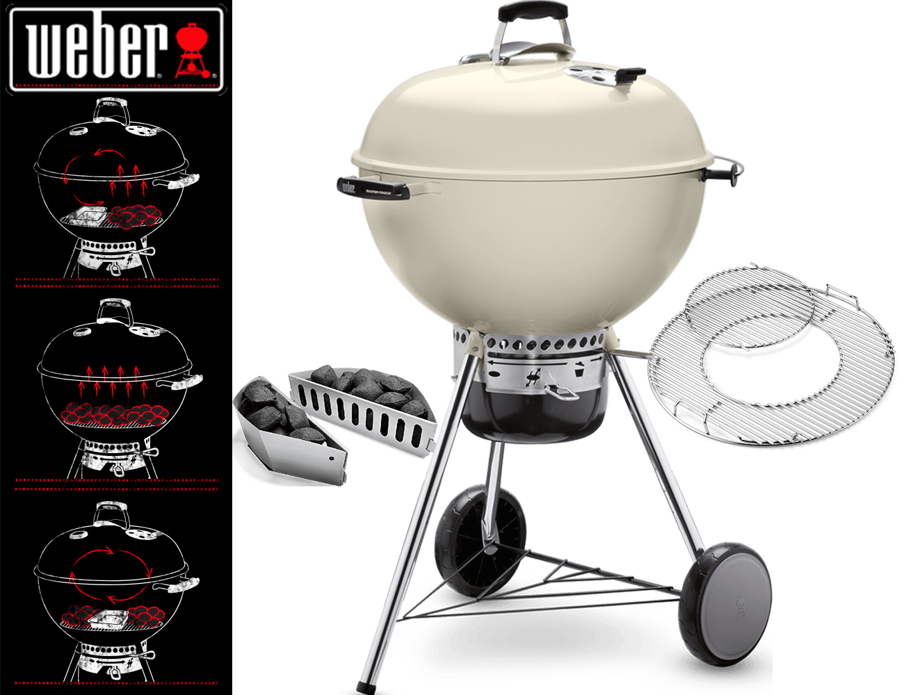 Barbecue in acciaio porcellanato, estremamente resistente alle intemperie e agli agenti atmosferici, ma attenzione a non colpirlo troppo forte. Il Master Touch ha in dotazione il supporto di serie per il coperchio, che permette di renderlo un comodo paravento e quindi di cuocere anche con il vento. Inoltre possiede 2 ganci porta utensili integrati nella maniglia del braciere, fondamentali per avere sempre gli accessori a portata di mano e nel contempo non distrarsi dalla cottura. Altra novità della serie è la griglia gourmet di cottura, che permette di ampliare la gamma di accessori utilizzabili sul barbecue con tutti quanti gli accessori Weber Gourmet. Sul coperchio è presente un utile termometro per la gestione delle temperature, in ogni fase della cottura: sia diretta (grigliata classica con cibo sulla brace), che indiretta (similmente a quella in forno ventilato, con carbone ai lati e cibo al centro della grglia di cottura, lontana dai carboni ardenti), oltre alle cotture cosiddette “low and slow” (bassa temperatura tra 100°C e 110°C). La ventola di areazione sul coperchio dispone di un pratico gommino anti-scottatura che ne permette la movimentazione anche a coperchio caldo, e aprendo o chiudendo la ventola si gestisce comodamente la temperature interna al barbecue. La griglia focolare dispone di 2 cesti separa-carbone utilizzabili in fase di cottura indiretta, per tenere separato il carbone ai lati del braciere. Il Master Touch dispone anche di sistema di raccolta delle ceneri, che faciliterà notevolmente la pulizia del barbecue, raccogliendo tutti i residui della combustione in un pratico pentolino facile da separare dal barbecue e da rimettere al suo posto.
