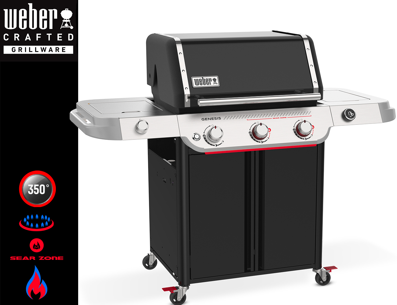 Un barbecue dalle prestazioni superiori con 3 bruciatori, Sear Zone, griglia Crafted, design accattivante e finiture premium. Ampi ripiani ripiegabili, armadietto chiuso e pannello laterale Weber Works per riporre gli accessori.