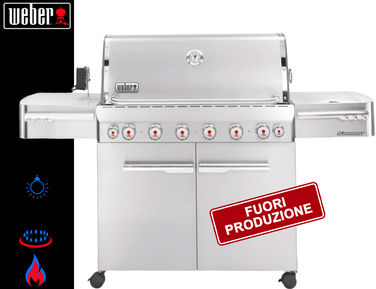 La gamma Summit della Weber è quanto di più possa desiderare un appassionato di Grill; persino i più esigenti verranno afffascinati dalle tante funzionalità di questo Grill. I termini che riassumono in loro l’essenza del barbecue Summit sono: gusto, compagnia e performance. Cucinare per un gruppo di 18 persone non sarà più un problema! Il modello S 670 GBS possiede tutti gli accessori degli addetti ai lavori: dall’affumicatore al girarrosto, ancora al fornello laterale. La lampada sulla maniglia permette la cottura anche in notturna, mentre le manopole retroilluminate donano quel tocco di classe ed eleganza che tutti vorrebbero nel proprio giardino di casa. Il girarrosto elettrico e non a batteria permette cotture di alimenti anche relativamente pesanti senza il rischio di appesantire il motore. Insomma, l’assistenza eccezionale del Summit S-670 vi permetterà di dare libero sfogo alla vostra fantasia culinaria.
